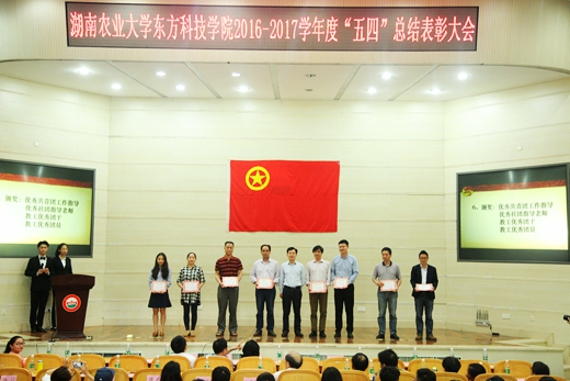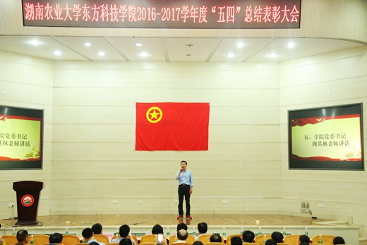 本网讯(团委 黄月飞)在中国共产主义青年团成立95周年,“五四”运动98周年之际,5月4日下午,学院2016—2017学年度“五四”总结表彰大会在图书馆大成厅隆重举行。院领导朱翠英、周其林、邵华、肖化柱、刘湘辉出席,学院各职能部门及学部负责人、全体辅导员老师、获奖集体和个人代表、团员青年代表参加了大会。