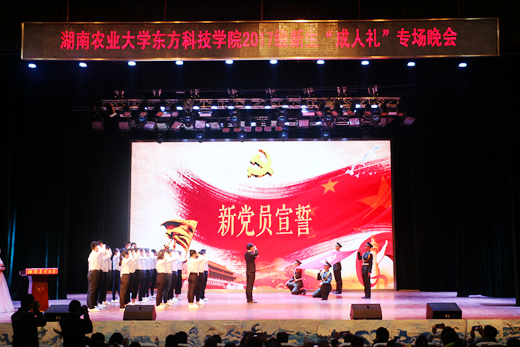 本网讯(团委 黄月飞)12月1日晚,学院团委精心策划、组织的“筑梦东方”2017级新生“成人礼”专场晚会在校大礼堂隆重举行。院领导朱翠英、周其林、邵华、刘湘辉出席,学院各职能部门和学部负责人、部分新生家长、全体辅导员、新生班主任及学院2017级全体新生齐聚晚会现场。