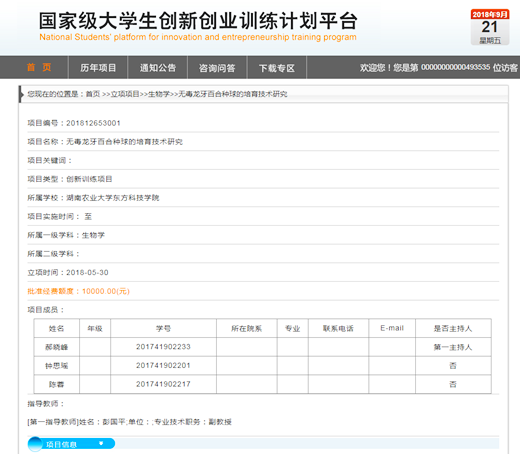 本网讯(教务部 曾波)近日,由我院生科系彭国平老师指导的,2017级生物技术专业郝晓峰同学为项目负责人,钟思瑶、陈蓉两位同学为组员的创新训练项目《无毒龙牙百合种球的培育技术研究》成功入围2018年国家级大学生创新训练项目。这是我院建院以来首次成功立项国家级大学生创新创业训练计划项目,打破了我院学生作为国家级项目负责人全程主导项目实施“零”的突破。