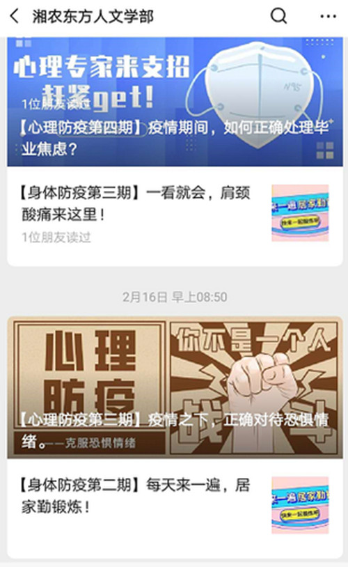 除此之外,赵文力老师坚持每天在线上陪伴因疫情影响在家隔离的李同学,给予心理安慰与支持;何学欢老师在其个人公众号上撰文,为学生心理减压提供多种方法;饶文竹老师与学生线上互动,及时疏导学生心理困扰,鼓励有需要的学生主动求助学校心理援助热线;张郭雨情老师引导学生发挥专业特长,积极主动关爱同学……