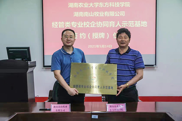 5月14日,湖南农业大学东方科技学院与湖南南山牧业有限公司经管类专业协同育人合作协议书签字仪式与授牌仪式,在湖南农业大学第九教学楼209会议室举行,仪式由学院教务部主任魏坚主持。学院常务副院长李觅路、教学副院长肖化柱、经管学部主任文春晖和湖南南山牧业有限公司董事长兼总经理姚慧、营销总监魏先超等参加了仪式。