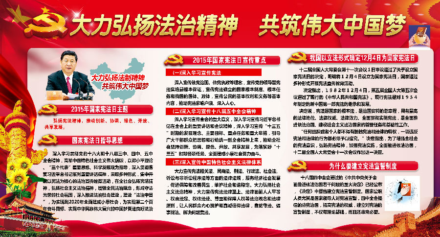 2015年的12月4日是第二个“国家宪法日”,也是第十五个“全国法制宣传日”,主题为:“弘扬宪法精神,推动创新、协调、绿色、开放、共享发展”。