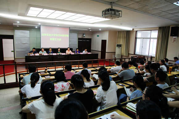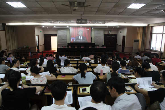 本网讯(党政办 张登高)7月8日下午,学院在九教南102教室举行2016年上学期期末教职工大会暨党委中心组(扩大)学习。院领导朱翠英、汪建训、史云峰、张胜利、邵华、肖化柱和全体教职工参加此次大会。会议由周其林书记主持。