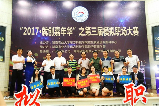 本网讯(招生就业创业指导中心 杨日映)6月8日晚,学院“2017·就创嘉年华”之第三届模拟职场大赛在图书馆大成厅顺利举办。本次比赛由学院招生就业创业指导中心主办、经济管理学部承办,湖南人民广播电台主持人王佳主持。学院副院长刘湘辉、招生就业创业指导中心主任黄正军、教务部主任魏坚、部分教师以及300多名学生观看了此次比赛。