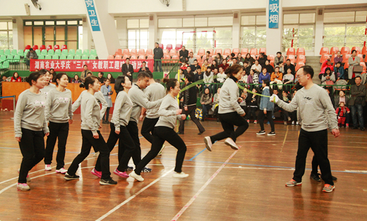 本网讯(党政办 朱骞)3月7日下午3点,湖南农业大学体育馆人头攒动,锣鼓喧天,由湖南农业大学工会组织的“三·八”女教职工趣味比赛在这里激战正酣。