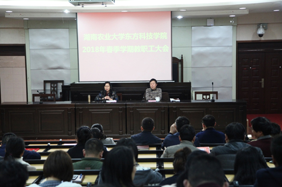 学院院长朱翠英传达了学校新学期工作部署会会议精神并对学院2018年工作作出了全面安排。朱翠英指出,2018年是学院发展史上至关重要的一年,全院教职工要凝心聚力,奋发图强,从做好学院发展调研、激发内部管理潜力、深化内涵发展建设、提炼思政工作成果、坚持党建中心地位五个方面着手,全面提高学院教育教学水平,提高人才培养质量,为实现学院“十三五”规划目标而努力奋斗。