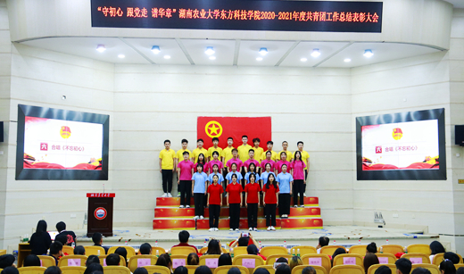 19时30分,大会开始,全体起立,高唱中国共产主义青年团团歌。现场播放学院2020-2021学年度共青团工作汇报视频《绽放青春 筑梦东方》。